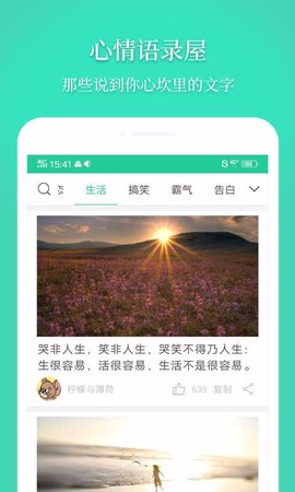 心情语录屋是一款专注于美句与名句分享的社交平台,汇聚了涵盖爱情、诗词、情感、励志、生活、搞笑、霸气、告白等多类别的优质语录内容。用户可在此浏览他人发布的精彩句子,进行点赞、复制或分享至其他社交平台;亦可自行创作并发布带有配图与标签的句子。平台还设有金币奖励机制,用户通过发布、分享等行为积累金币,达到一定数额后可兑换为现金并支持提现。